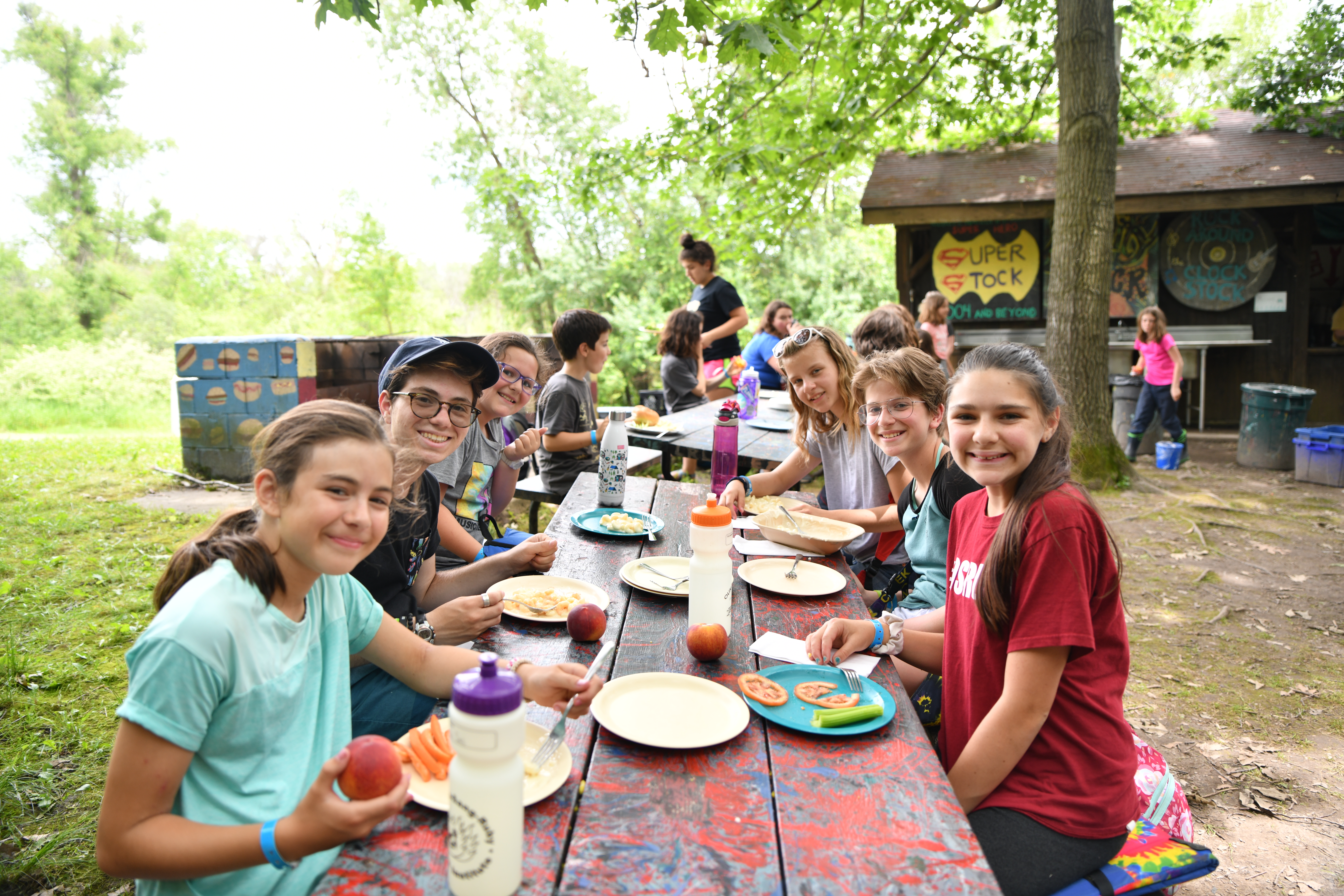Meals are an important part of camp life at OSRUI. We say Hamotzi (blessing over the meal) before we eat and join together in Birkat Hamazon (grace after meals) after we eat. We strive to have options at meals so that everyone can find something they are excited about and our staff help ensure that all campers are well-fed and dietary needs are met. In addition to meals, we generally have snacks twice a day to help keep us going in the midst of a busy day at camp!